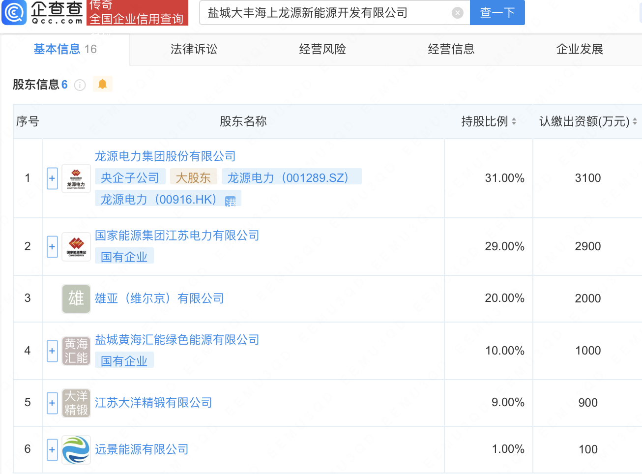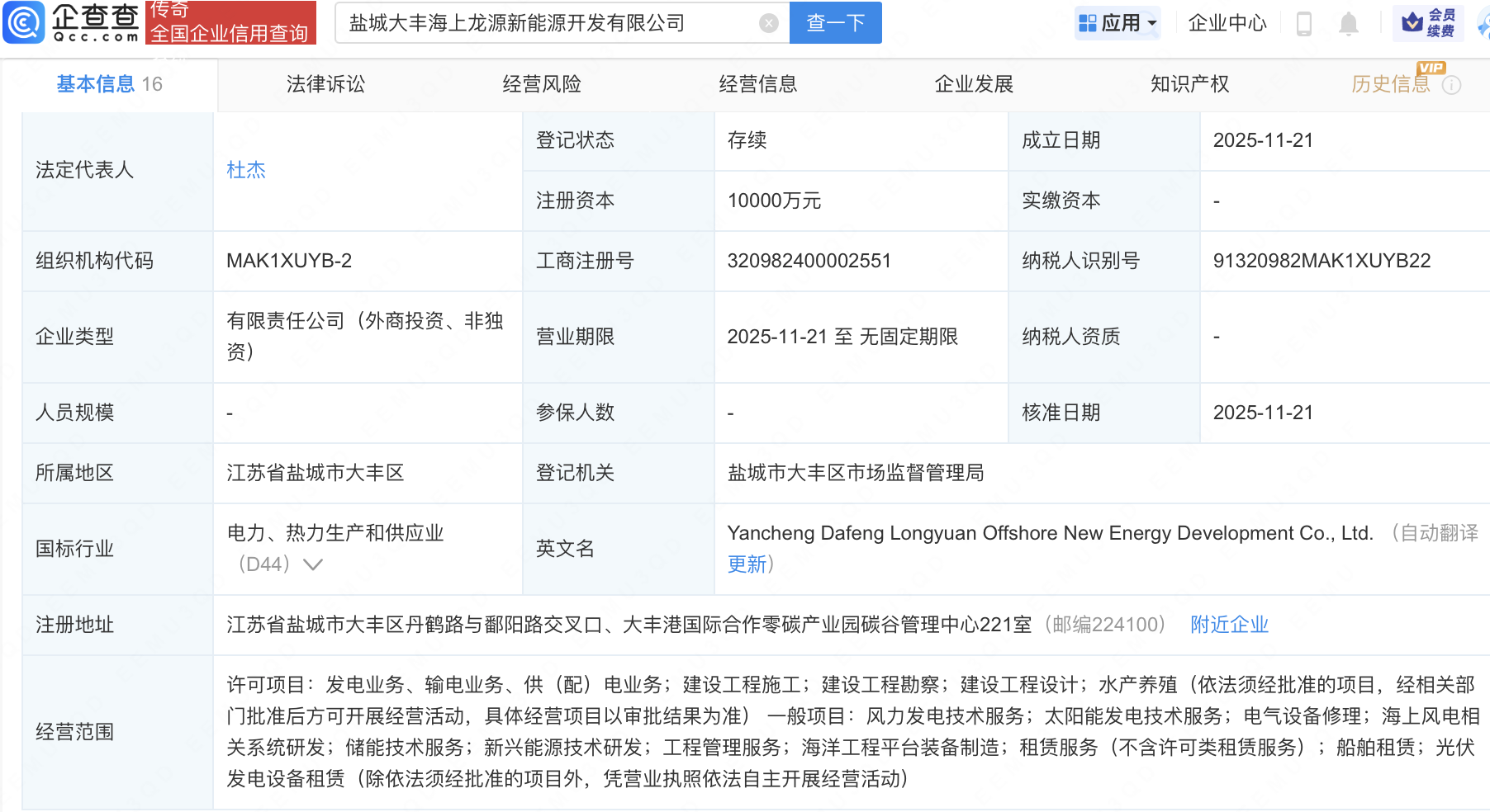 近日,盐城大丰海上龙源新能源开发有限公司成立,注册资本1亿元,经营范围包含:风力发电技术服务;太阳能发电技术服务;电气设备修理;海上风电相关系统研发等。企查查股权穿透显示,该公司由龙源电力(001289)、远景能源有限公司等共同持股。