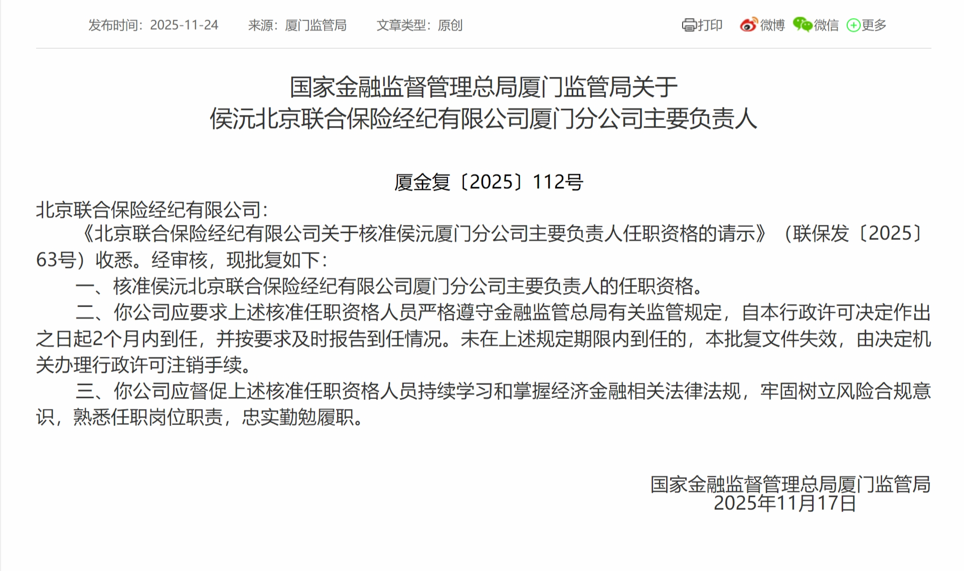 11月24日,国家金融监督管理总局厦门监管局发布《关于侯沅北京联合保险经纪有限公司厦门分公司主要负责人》的公告,核准侯沅北京联合保险经纪有限公司厦门分公司主要负责人的任职资格。
